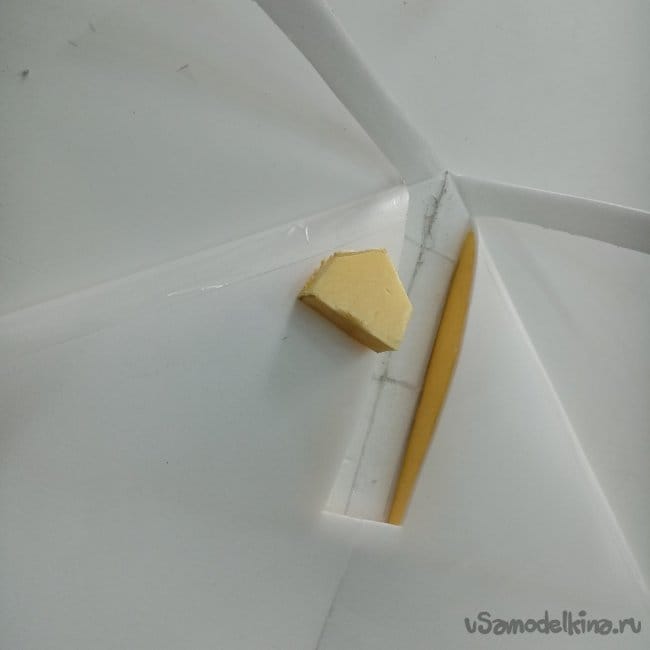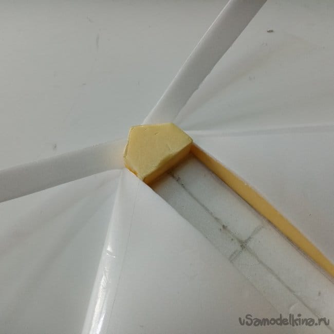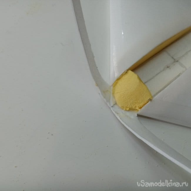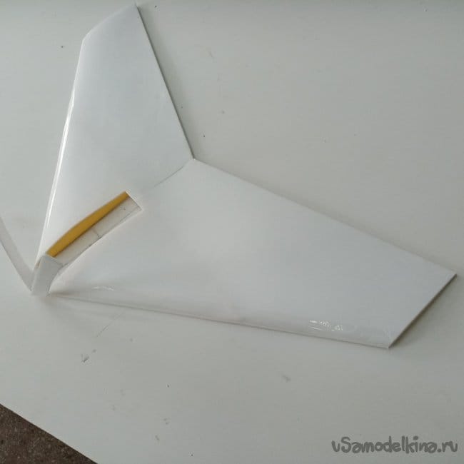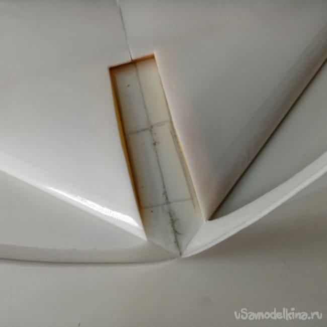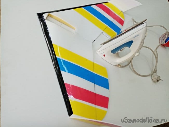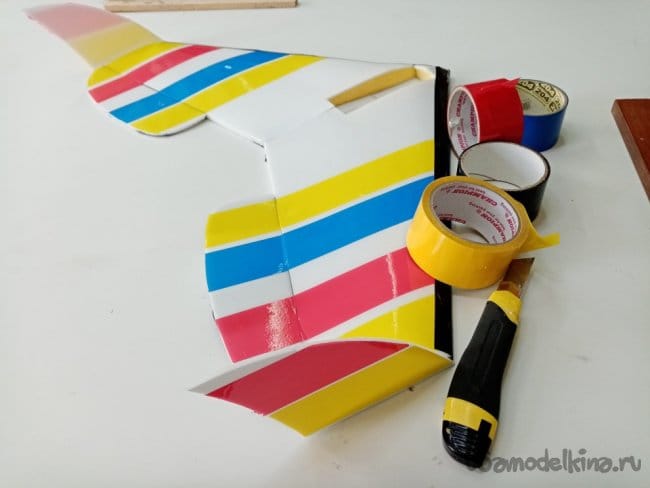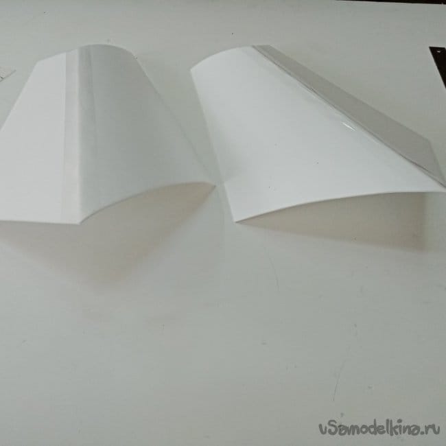 Наклеиваю на переднюю грань крыла скотч и приглаживаю его хорошенько кусочком пенопласта. Для гарантии, что крыло не сломается при сгибе кромки.