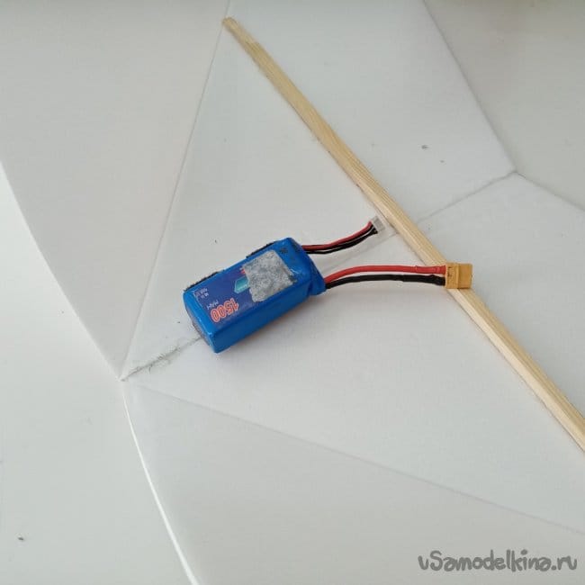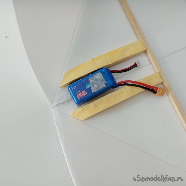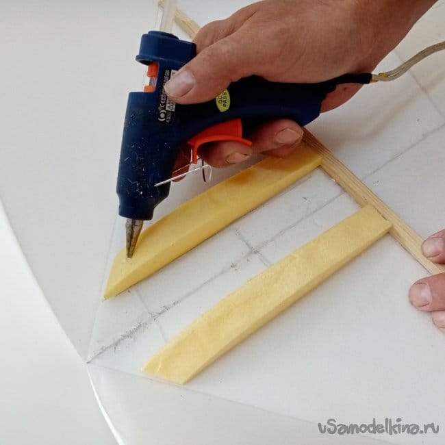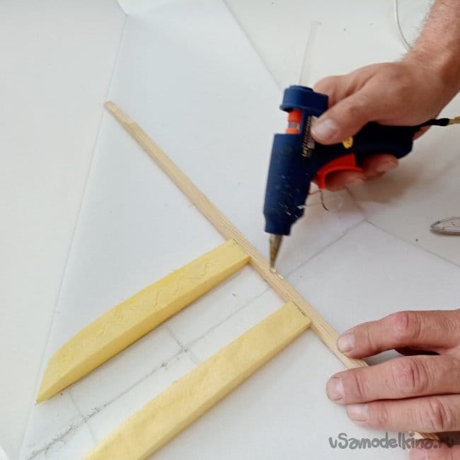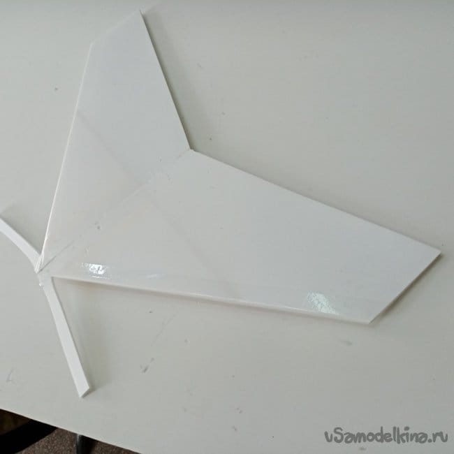 Затем наношу клей и соединяю нижнюю обшивку крыльев. Остыло достаточно быстро и прочно получилось.
