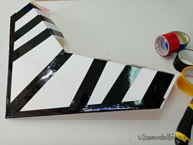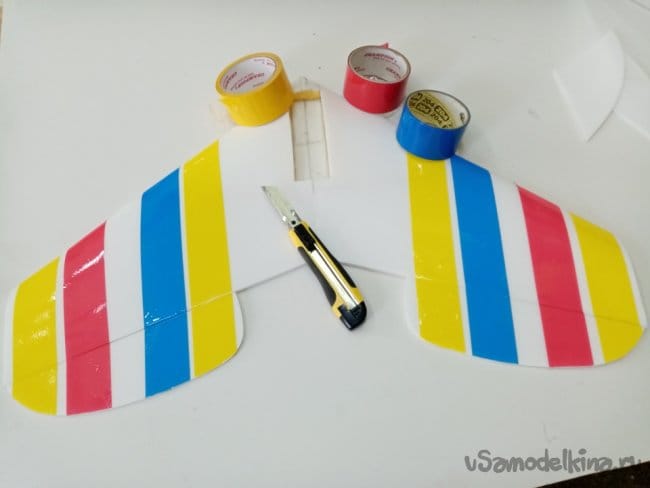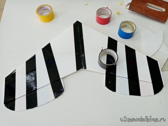 Отрезаю грани элевонов под 45 градусов и навешиваю на скотч, заодно получаются неплохие декоративные полоски.