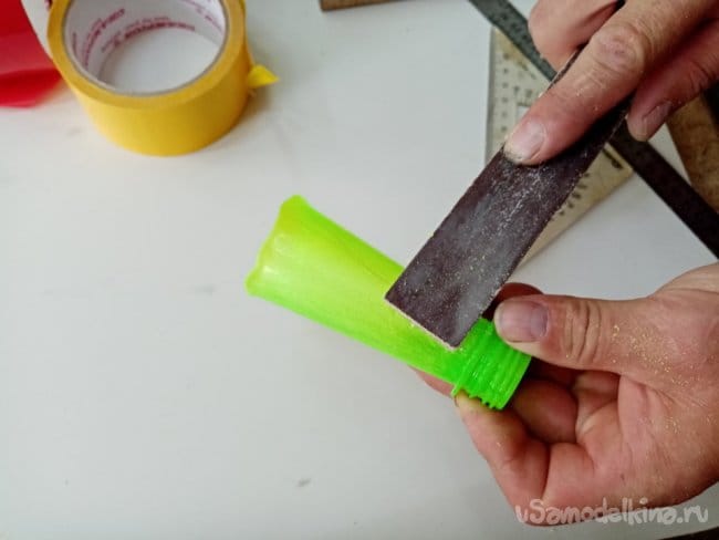 Мотораму изготовил из бутылки с длинным горлышком, предварительно потер крупной шкуркой для лохматости.