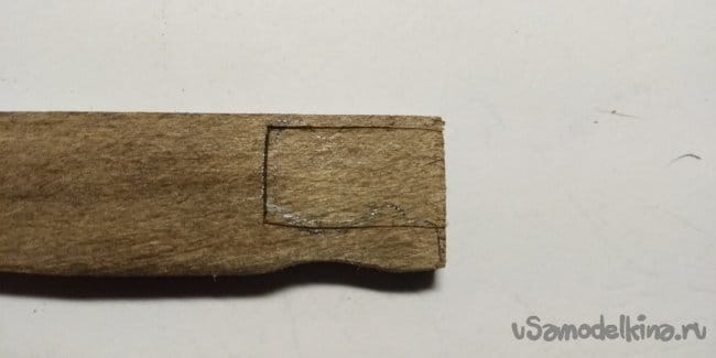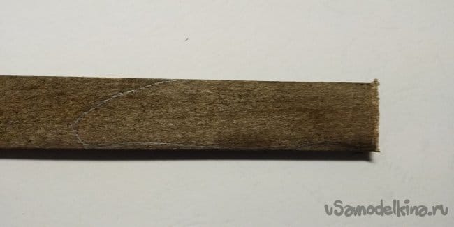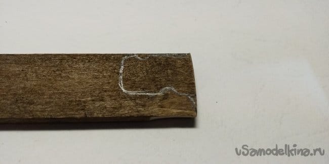 Далее я обвел хвостовик клинка, чтобы знать, где выбирать древесину. Хотя я мог найти или сделать прокладку между плашками, в которой вырезать потом форму хвостовика и склеить всё без проблем, но материалов, как всегда, не было.