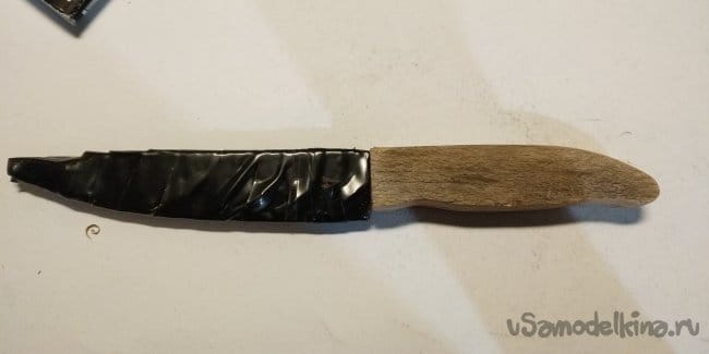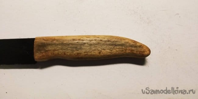 Далее я покрыл ручку ножа маслом, чтобы выделить фактуру. Выделил только серость, но это даже не плохо. Я где-то даже видел дорогущий набор ножей с похожими ручками.