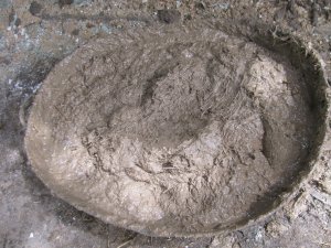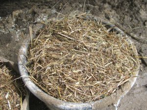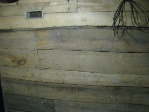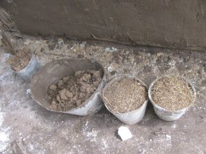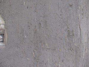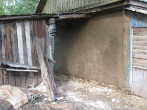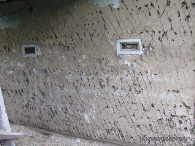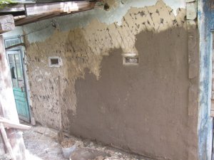 Стена из дерева, снаружи дранка, глина с песком. Сожрал эту стену дятел, ну а я ободрал, что сыпалось. Думаю все хорошо промочить и поштукатурить с той же глиной с половой. Это бесплатно и вполне крепко.