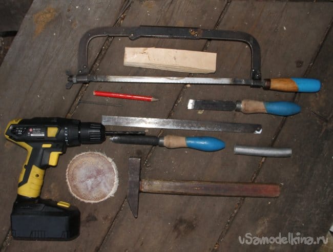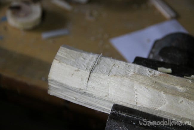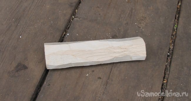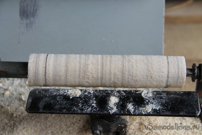 Выбрав заготовку из берёзы, обрезаем её по длине так, чтобы она входила в токарный станок.
