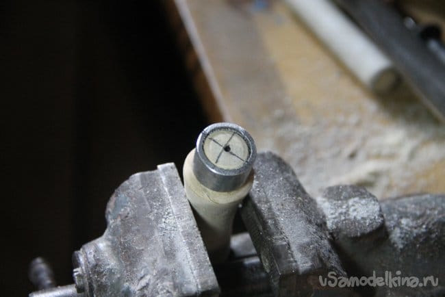 Снимаем заготовку со станка и спиливаем концы и прошкуриваем их. Отпиливаем при помощи ножовки по металлу от алюминиевой трубки 10-15 мм. Забиваем это кольцо на переднюю часть ручки и сверлим глухое отверстие на глубину 40-50 мм сверлом диаметром 2 мм (это нужно, чтобы при забивании стержень не расколол ручку).