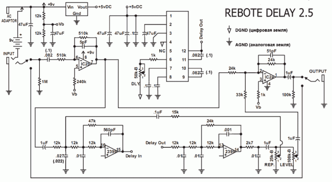 Конкретно данная схема, как это принято в кругах гитарного оборудования, имеет своё название - Rebote Delay 2,5. Схема разработана уже сравнительно давно - в 2000-м году, однако как показывает практика — старая не значит плохая. Главным преимуществом схемы является простота её повторения: при правильном монтаже схема практически не требует настройки.