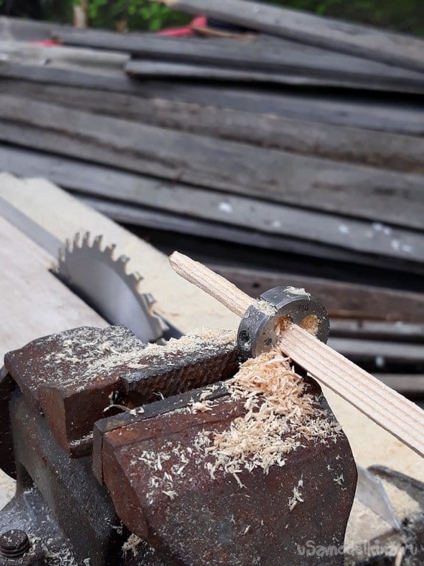 Затем заточил один конец рейки, как карандаш (для захода в плашку), а второй конец под цилиндр, что бы можно было зажать в патроне дрели. Зажав плашку М8 в тиски, прогнал напиленные рейки через нее.