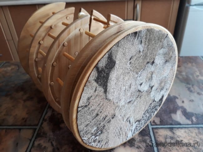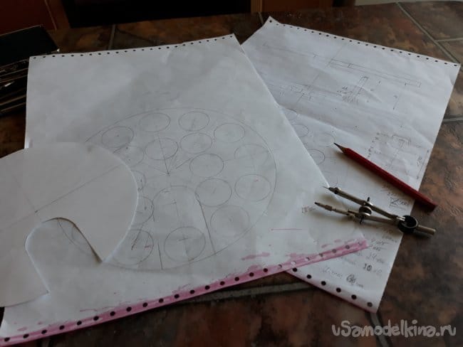 А, кто-то будет выпиливать сам из имеющейся фанеры или широкой доски и диаметр у него будет по меньше. Количество ярусов каждый может определить для себя сам, от этого зависит размещенное количество катушек. У меня три яруса и размещается 98 катушек с нитками. К сведению катушки с нитками разные и по высоте и по диаметру, это надо учитывать при прорисовке размещения катушек. В моей конструкции на нижнем ярусе размещаются низкие толстые катушки.