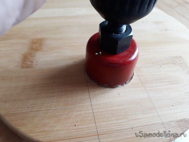 Далее вырезал из ДСП брусок 50 х 50 мм. По углам просверлил отверстия для шурупов, что бы можно было закрепить на основании. В центре бруска просверлил центрирующее отверстие для корончатого сверла.