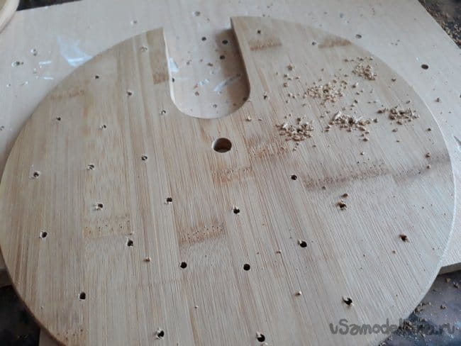 Произведя разметку паза на основаниях второго и третьего ярусов, а также на крышке, просверлил направляющие отверстия.