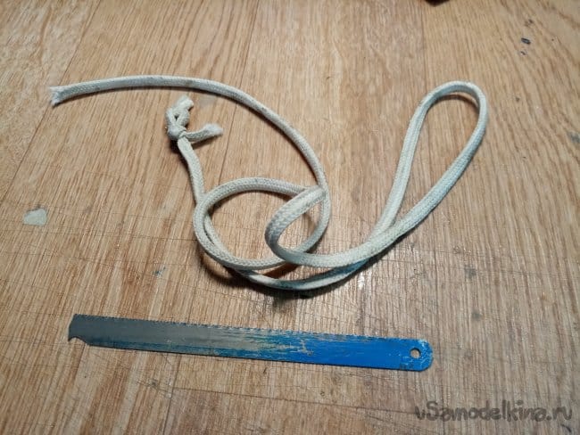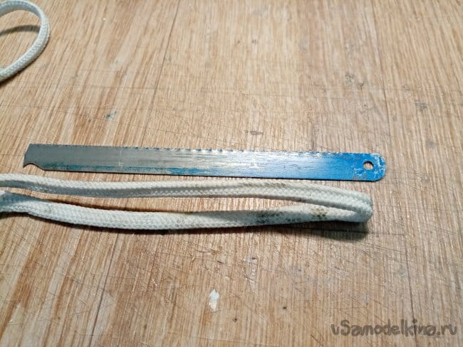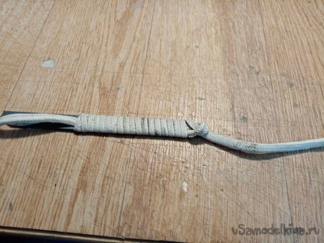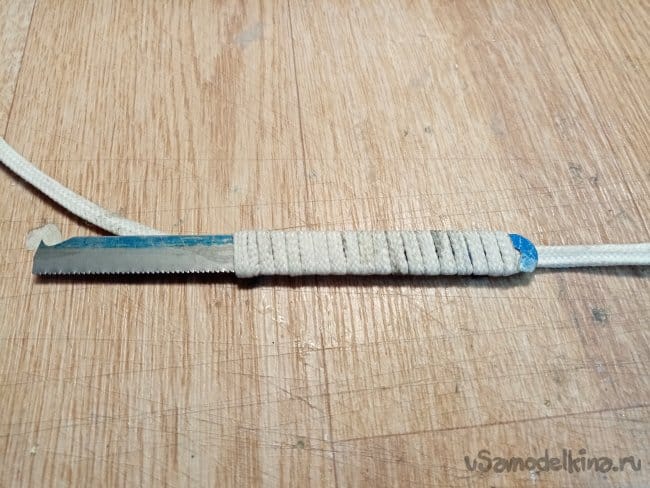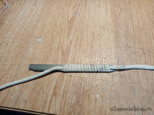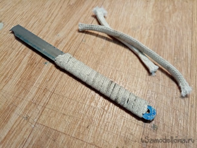 Туго обматываю мой скребок. Кончик шнура продеваю в петельку на конце.