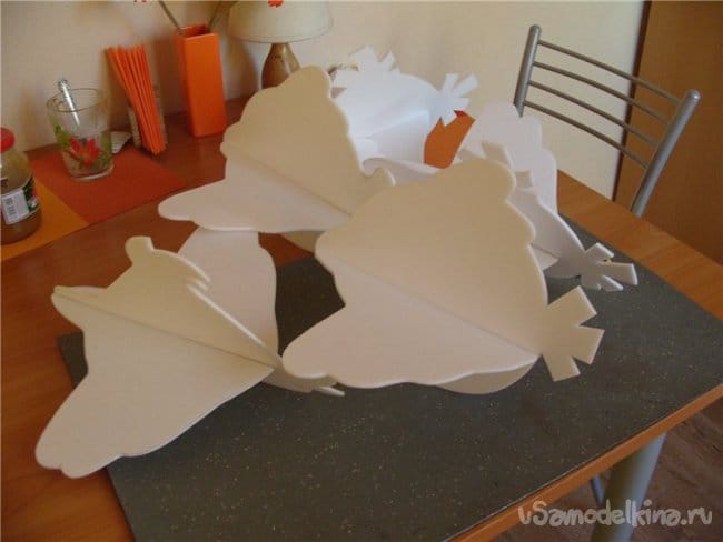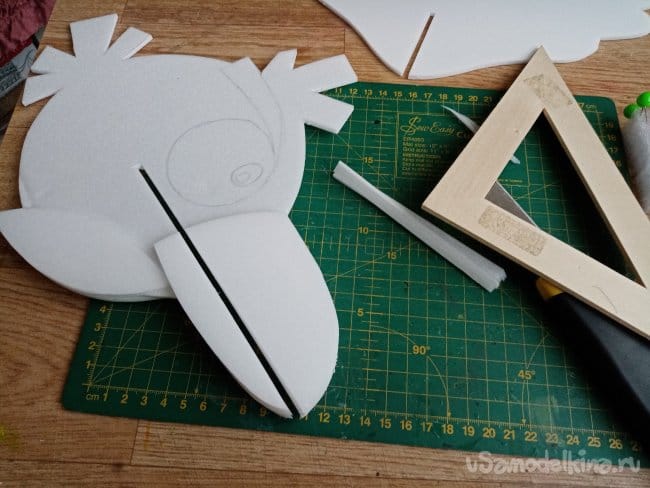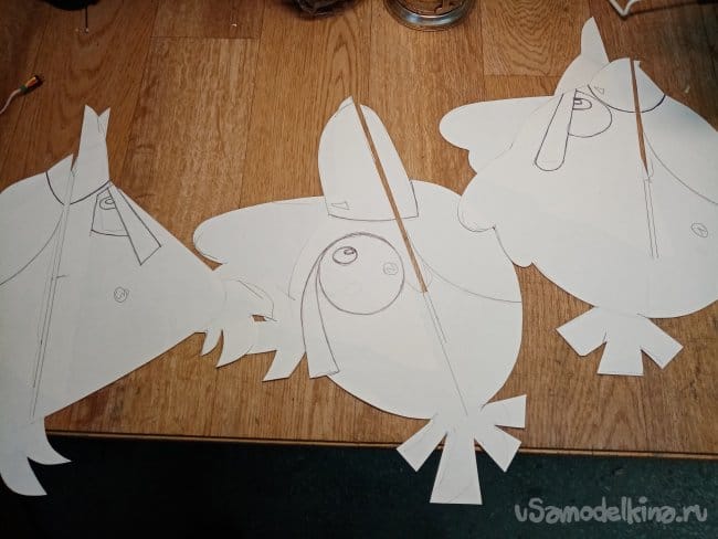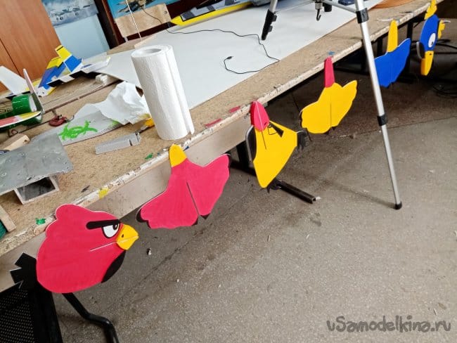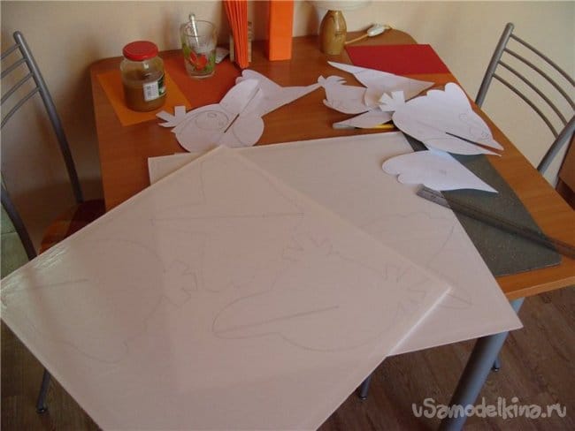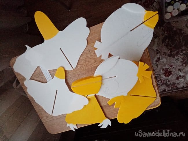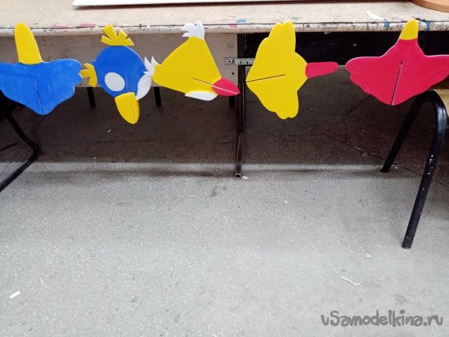 Продолжаю, вырезаю прорези в тушках и накладки на клювики. Будут противовесом хвостику, центр тяжести подозреваю слишком задний. Всего по четыре накладки и лапки на брюшке.