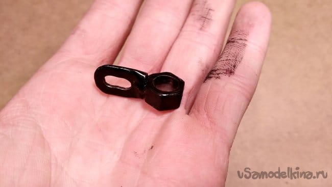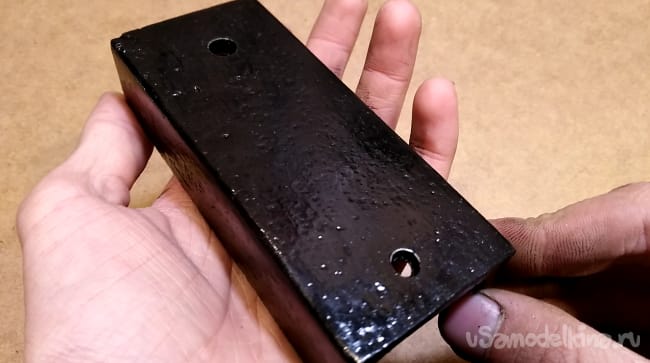 Основание сделано из швеллера размерами 12×5х3 см. В швеллере были просверлены два отверстия, одно под гайку м8, которую нужно приварить, а второе под стойку с винтом м6.
