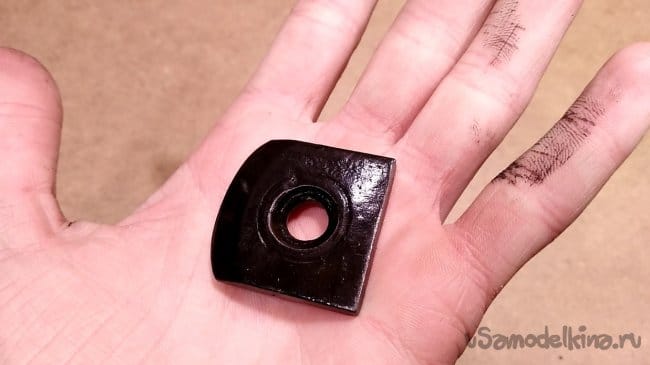 Прижимная пластина сделана из полосы 3,5 мм, размерами 4×3,5 см. По середине сделано отверстие под потайной болт м8, ну, а с одной стороны сделан спуск.
