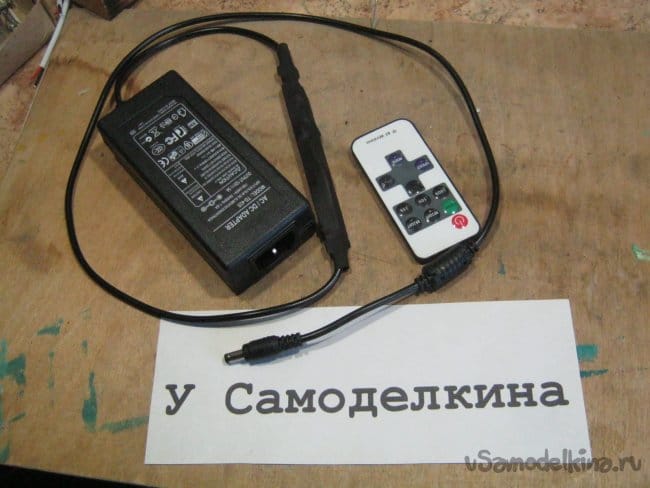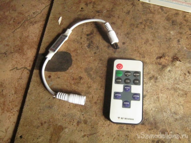 В светильниках такого рода мы применяем светодиодную ленту белого цвета свечения. Это прекрасный источник света для конструкций такого рода – он весьма компактен, экономичен, безопасен, неразорительно стоит. Существуют также несколько типов недорогих контроллеров повышающих удобство в эксплуатации такого светильника. Для белой светодиодной ленты в светильнике, возможности такого контроллера невелики (по сравнению с трехцветной) но весьма ценны. Это дистанционное включение и изменение яркости. Разные режимы мигания в данном применении не востребованы. Модуль имеет стандартные разъемы и включается в разрыв низковольтного провода питания. Добавить, убрать, заменить его можно в любой момент.