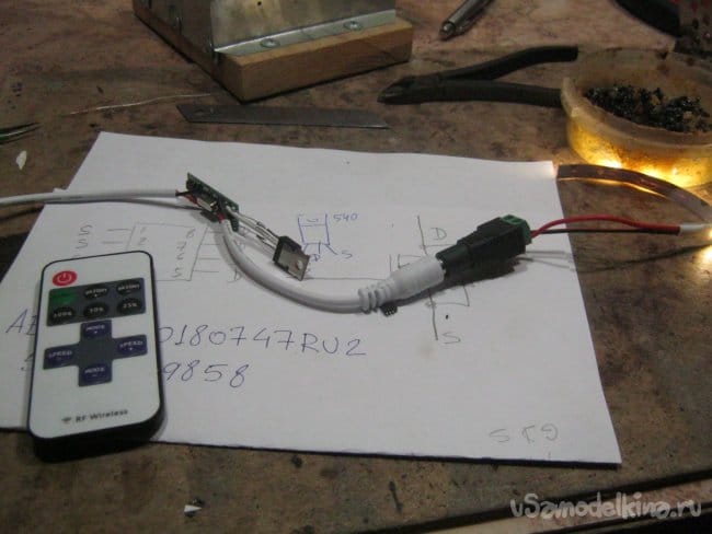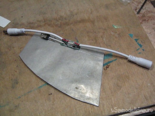 Окончательная конструкция модуля имеет узковысокое основание-теплоотвод и закрепляется в разрыве низковольтного провода относительно мощного (5А) блока питания.