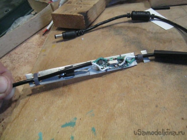 Низковольтный провод блока питания разрезан в удобном месте, концы проводов зачищены от изоляции и залужены. Исподняя изоляция сочтена не вполне надежной и усилена слоем тонкой термотрубки. Концы проводов подключены к нужным контактным площадкам, кабель закреплен ниточным бандажом, тот проклеен БФ-6. После проверки работоспособности, поверх модуля усажена термотрубка (не забыть одеть на провод заранее, до пайки).