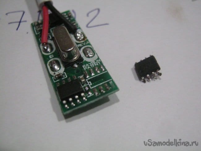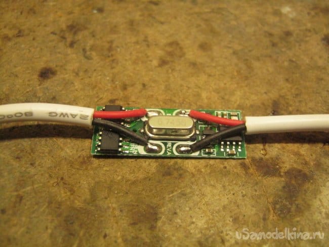 Модуль, включающийся в разрыв провода питания заключен в термотрубку. Посередине платы виден кварцевый резонатор задающий частоту радиоканала, кстати, у всех контроллеров он одинаков – если в помещении несколько контроллеров, все они будут реагировать на манипуляции с одним, любым из пультов ДУ. Антенна приемника печатная. Всё исполнение – SMD. Видим весьма тонкий провод, механическое его крепление отсутствует (грубая ошибка при проектировании – здесь, наверняка сознательное удешевление).