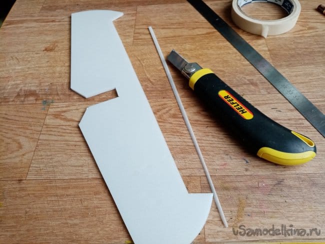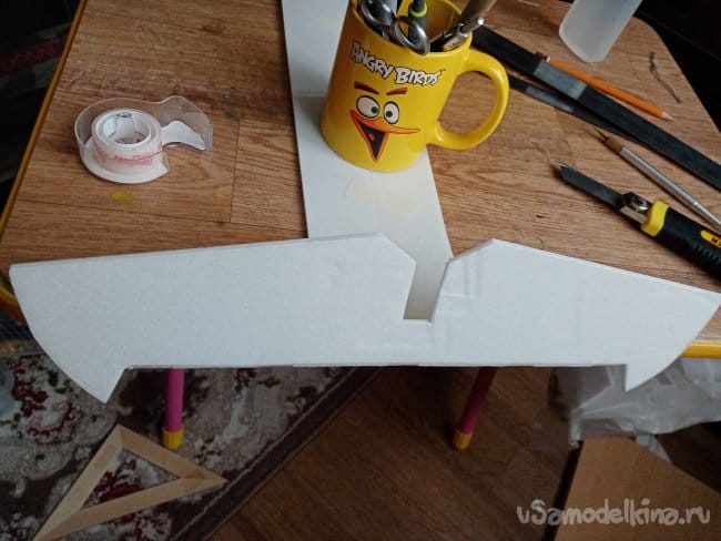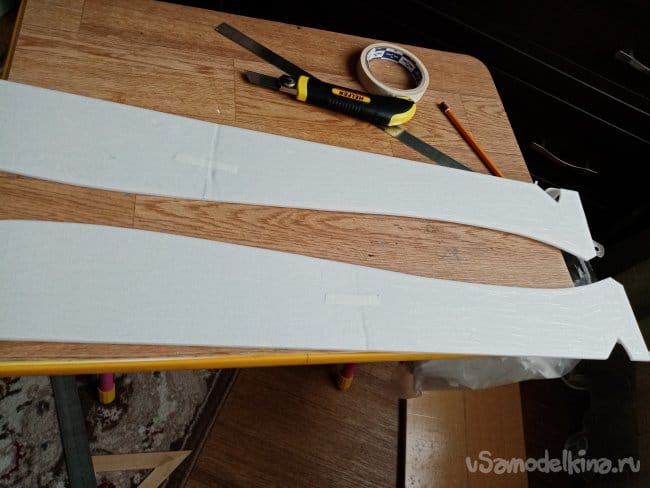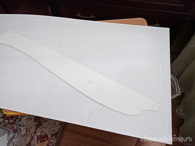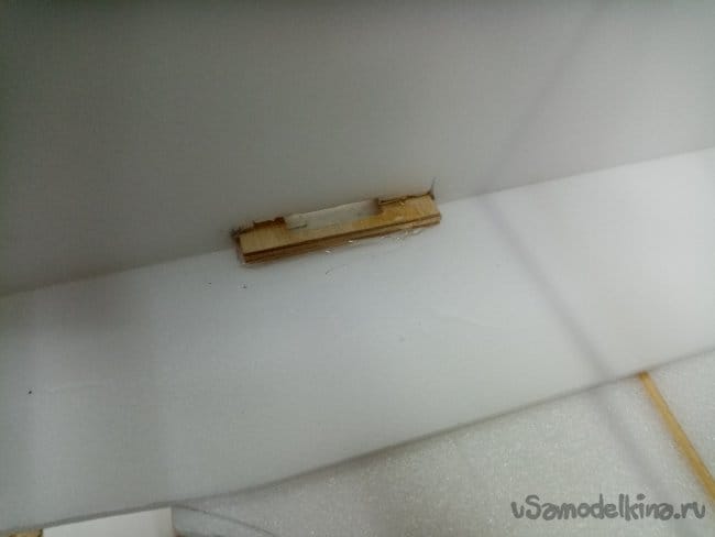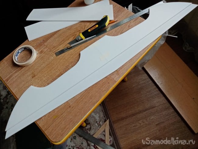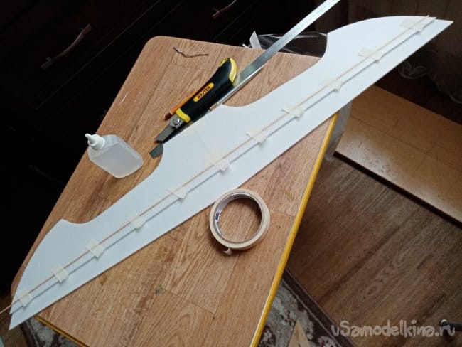 Вырезаю крыло, накладку склеиваю вместе и затем врезаю лонжерон усиления из сосновой рейки 2х8 мм.