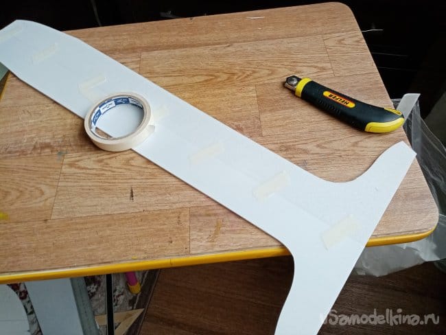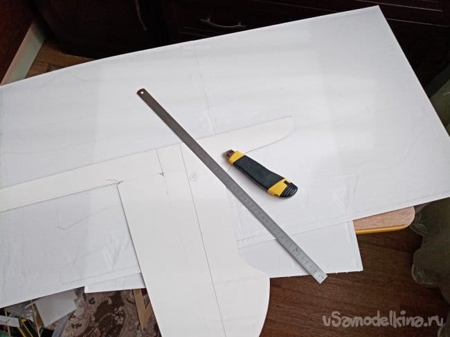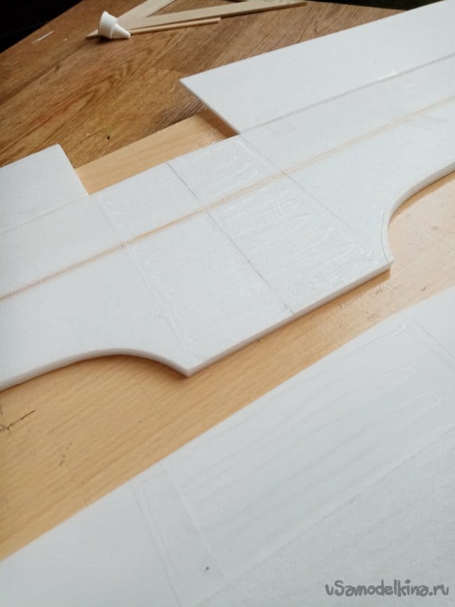 Вырезаю и склеиваю нижнюю часть фюзеляжа из двух слоев потолочки т,е, 8мм. Обратите внимание как расположены полосы клея титан на заготовках. На одной вдоль, на другой поперек, крестиком короче. При нанесении клея на заготовку первую полосу делаю по краю, важно хорошо проклеить. Внутри практически штрихую крест накрест как карандашом.