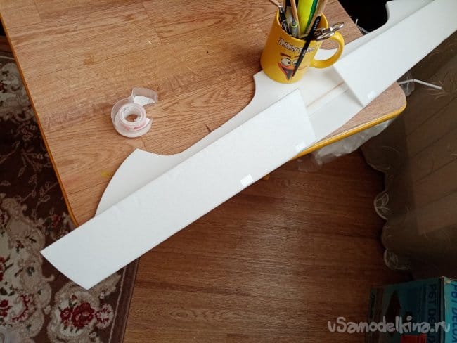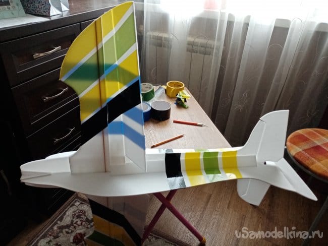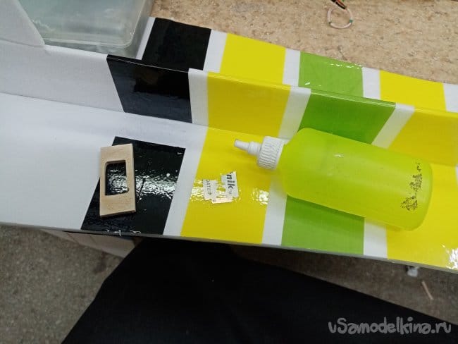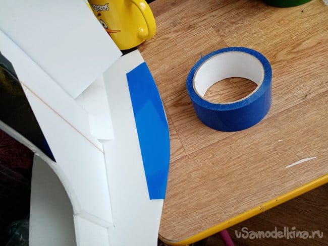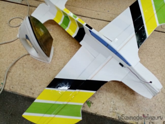 Приварил скотч утюгом удобнее конечно делать это на разобранном самолетике. Как-то упустил этот момент.