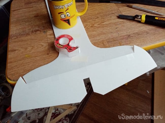 Отрезаю внутренние грани элеронов под 45 градусов и навешиваю на мой любимый скотч 3М супер кристалл. (Есть только один СКОТЧ-все остальное липкая лента!