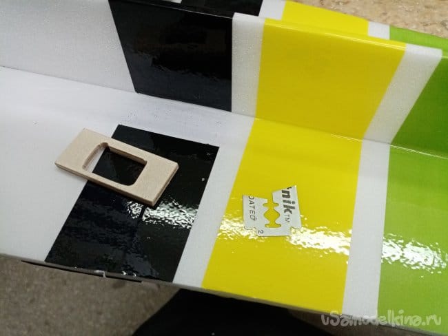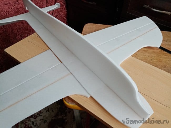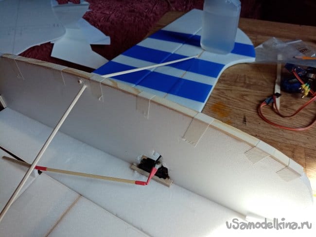 Когда крыло установлено , но еще не приклеилось напрочь, проверяю правильность установки. Расстояние от кончика крыла до кончика элеватора должно быть одинаково с каждой стороны.