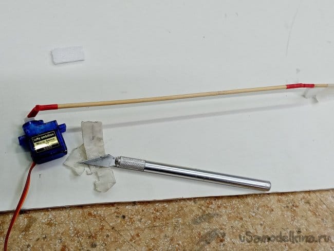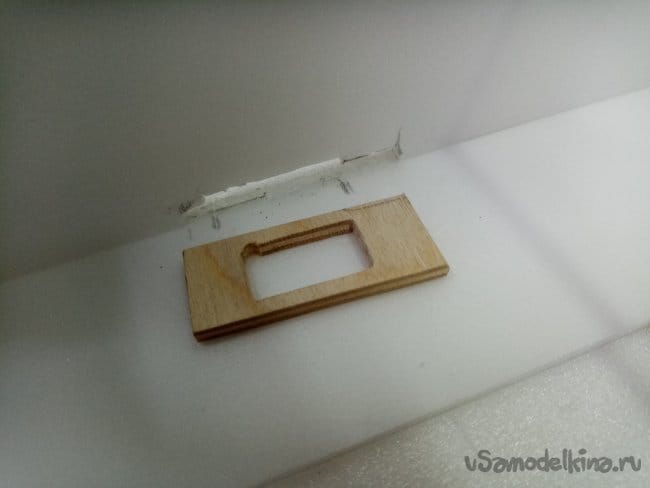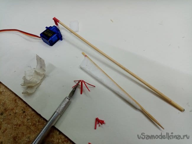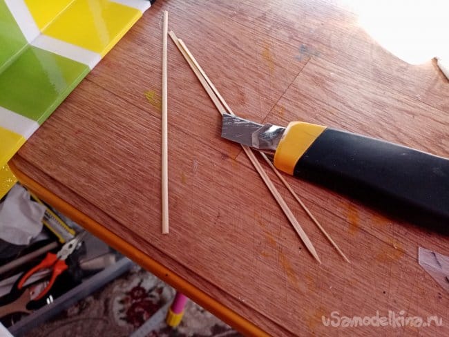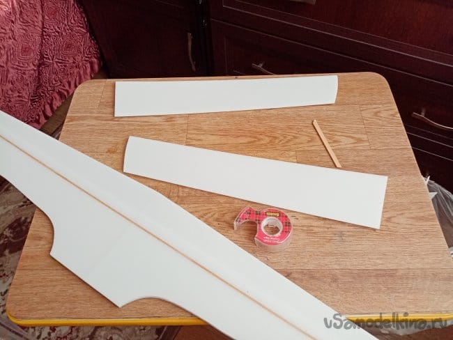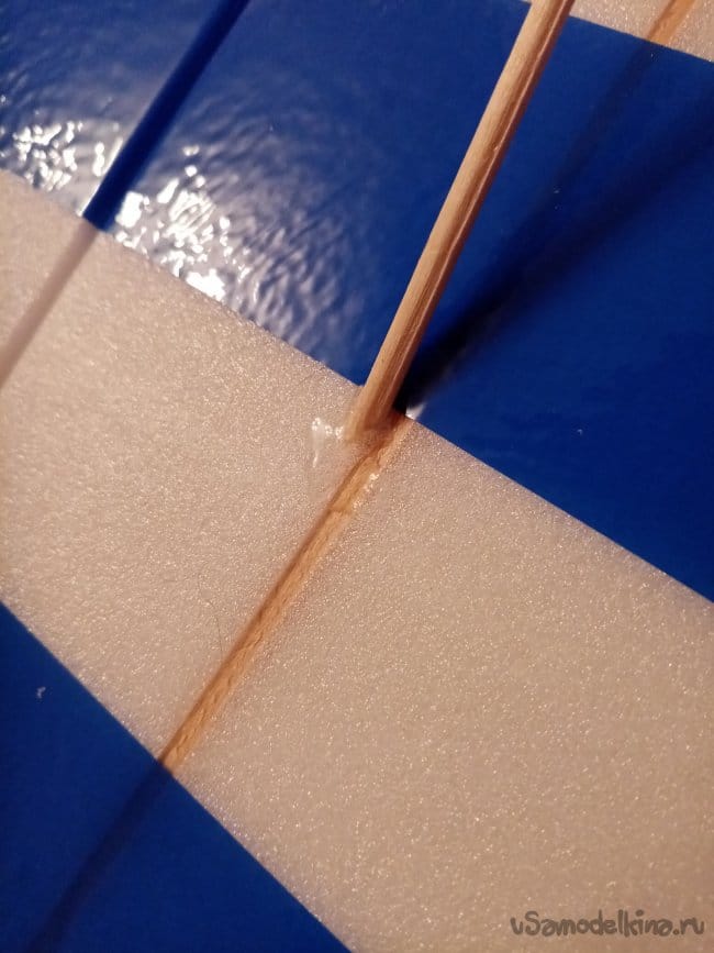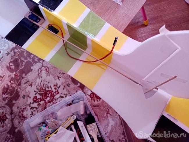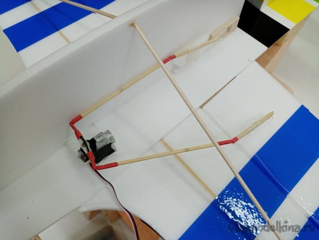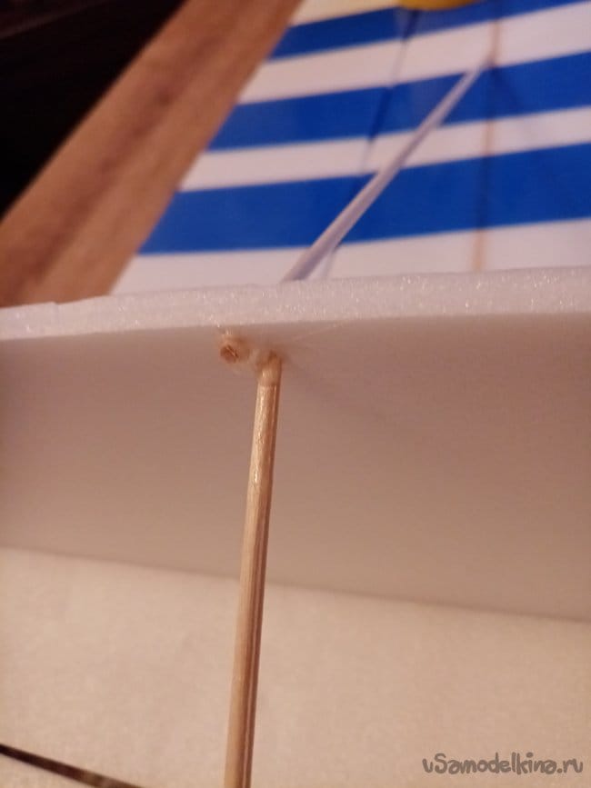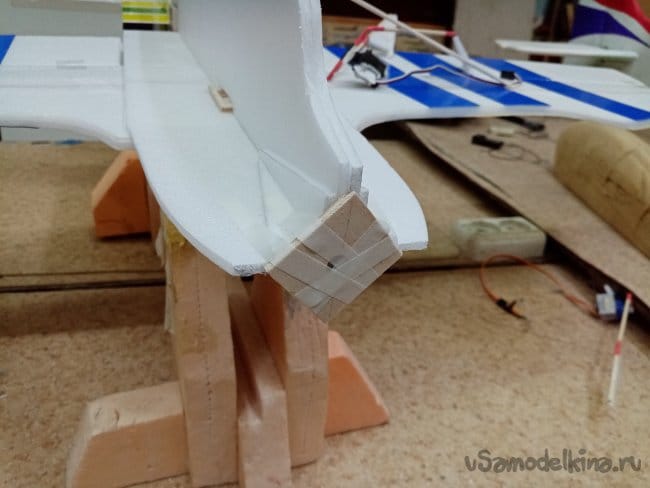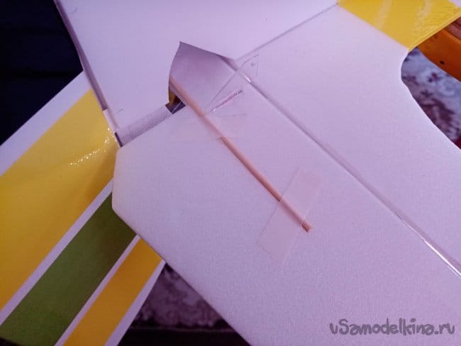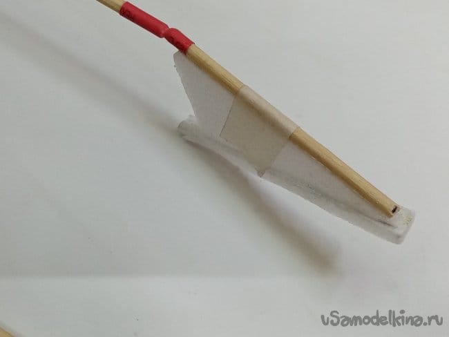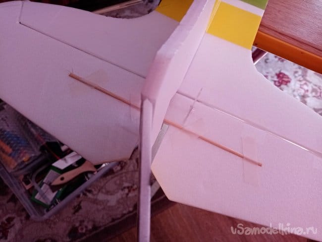 Забыл врезать усиление на элеватор. Расщепляю бамбуковую шпажку и приклеиваю снизу, фиксирую малярным скотчем.