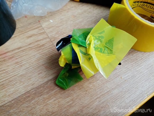 Комкайте обрезки и склеивайте их в кучку, иначе на столе и других предметах может остаться цветной клей от пленки, отмывать придется уже бензином.
