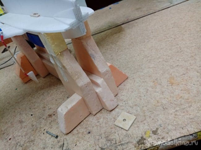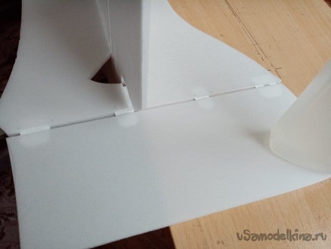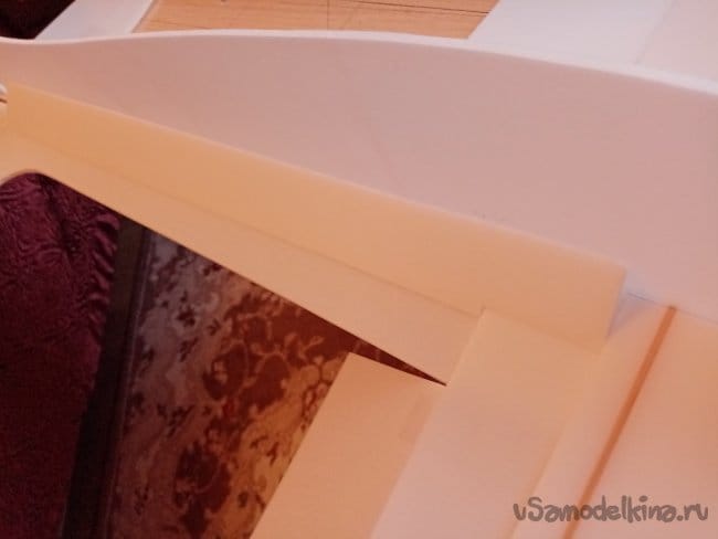 К этому элементу уже сейчас можно закрепить элеватор. Срезаю внутреннюю грань конструкции под 45 градусов и навешиваю на скотч.