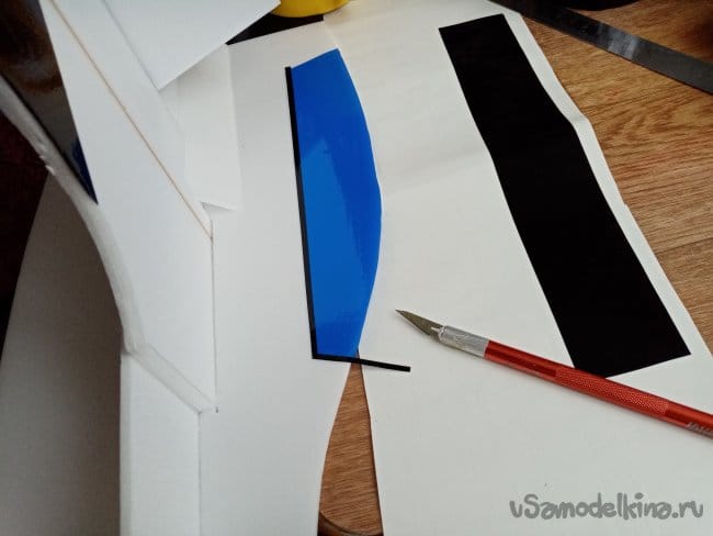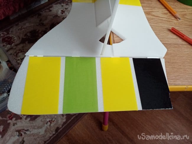 Накладки на хвостовую часть фюзеляжа под 45 градусов. Отрезаб края полосок наискосок и приклеиваю с двух сторон на хвостик.