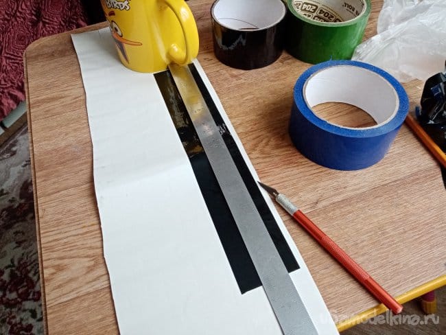 На подложке от рекламной пленки оракал или какой другой фирмы нарезаю из черного скотча полоски для окантовки.