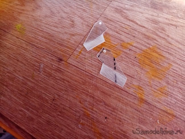 Кабанчики на рудер элеватор из прозрачного пластика от рассеивателя экрана ноутбука. Толщина примерно 06, достаточно вязкий и прочный пластик, сломать проблематично. Потер крупной шкуркой для лохматости повышаю прочность склейки.