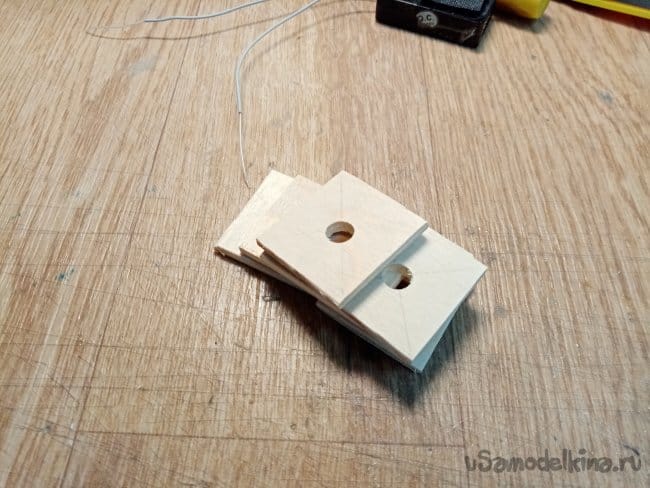 Вырезаю рудер, срезаю внутреннюю грань под 45 градусов, но уже с обоих сторон и навешиваю на пластиковые петли. Предварительно потерев их крупной шкуркой для лохматости, повышая прочность склейки. Можно перфорировать иголкой с двух сторон, получается значительно крепче вклейка. Или изготовить, прокатку как у меня из гвоздя и шестеренки от часов,частично механизировав процесс.