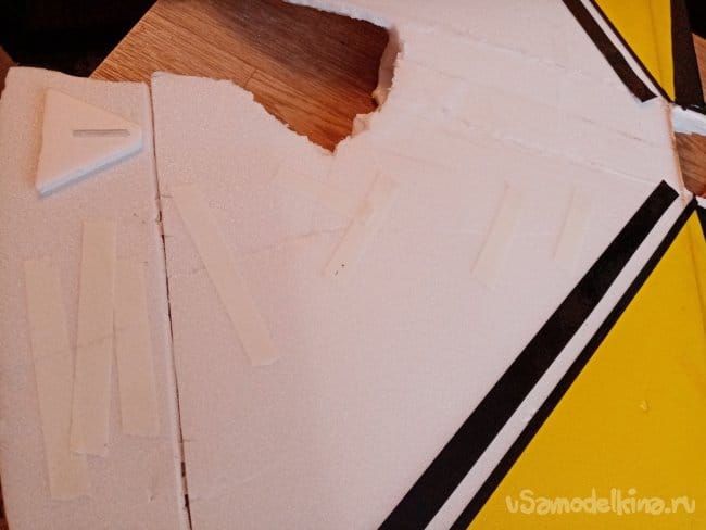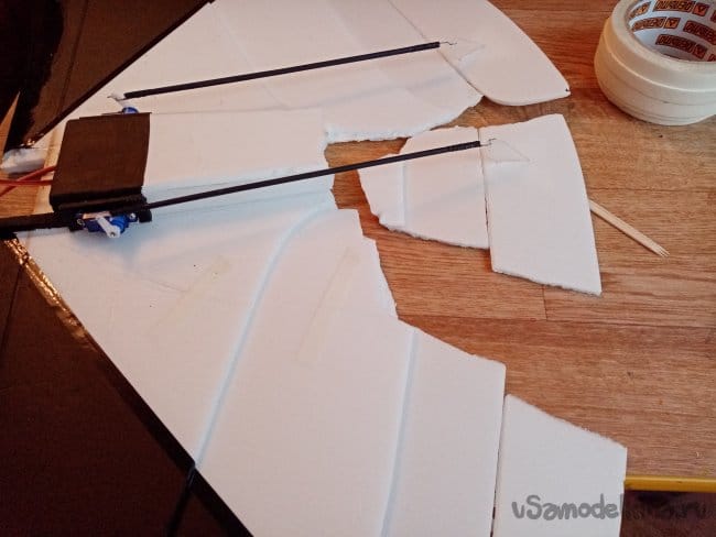 Довольно большая дырдулька в хвостовой части в районе флаперона. Собираю все осколки в кучу, промазываю торцы клеем, выжидаю минут 7-9 и соединяю. Подсохший клей схватывается практически мгновенно. Стягиваю края малярным скотчем с обоих сторон, внимательно контролирую плоскость. При стяжке, элементы должны состыковаться ровно, без прекосов.