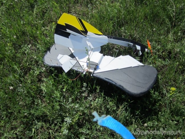Расколот и оторван флаперон, расколот на две половины фюзеляж и оторван носик, Трещины на крыле, практически оторван и расколот хвостик. А так-же многое другое.