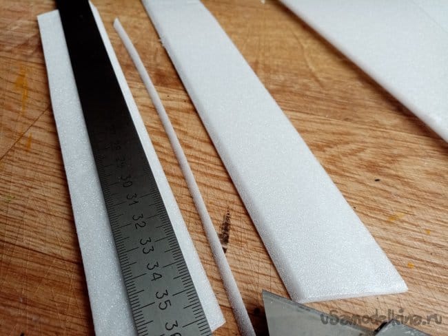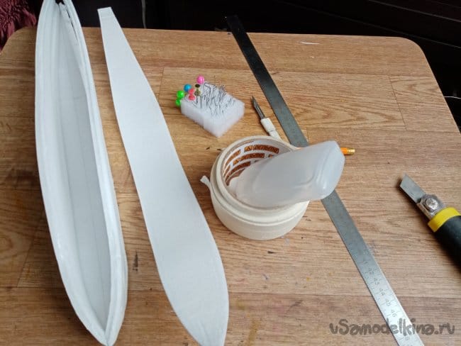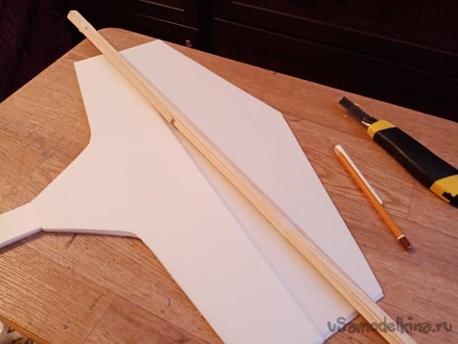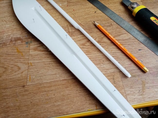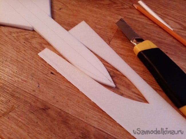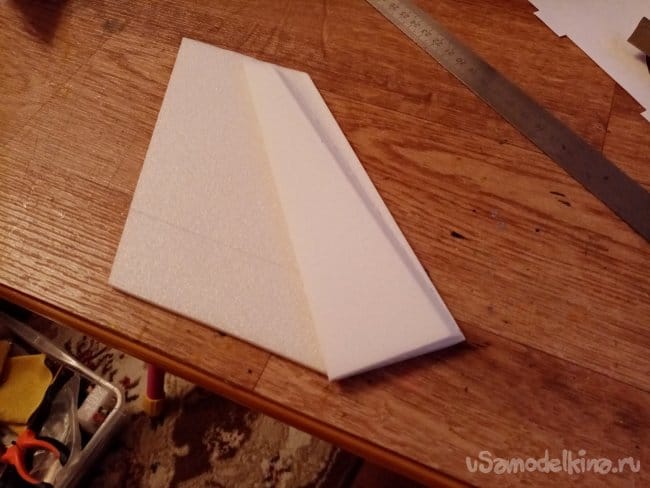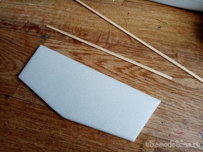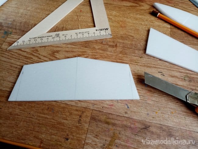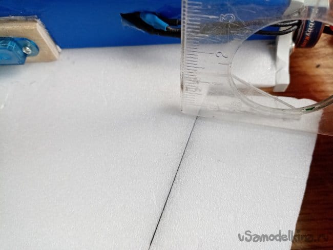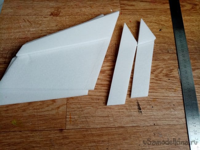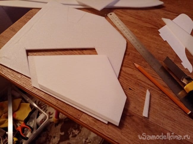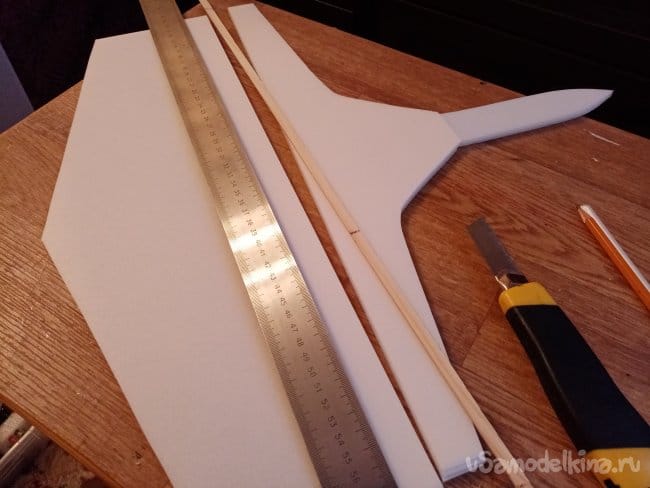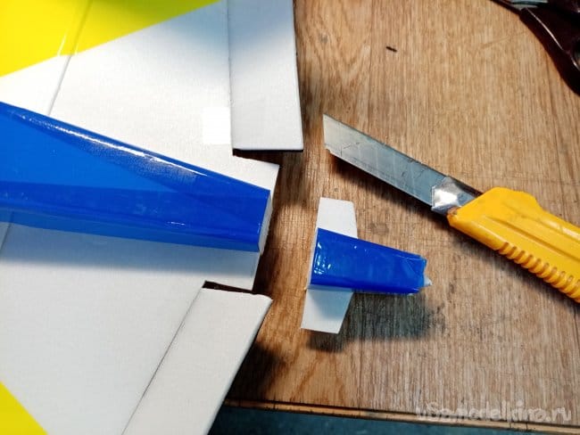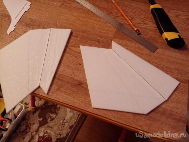 Отрезаю торчащие концы рейки. Отрезаю элевоны, решил в этом варианте сделать побольше. В предыдущем они располагались только на концах крыла, в районе винта была простая плоская пластина. Кончики моих элевонов будут прямо попадать в поток от винта и маневренность будет значительно выше. Все правильно думал..но, как оказалось зря....