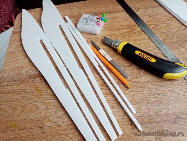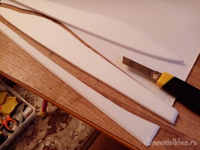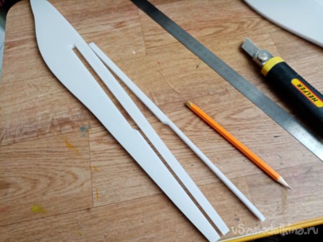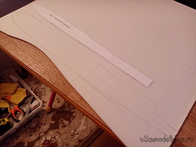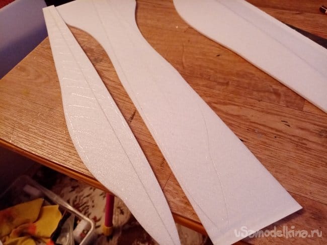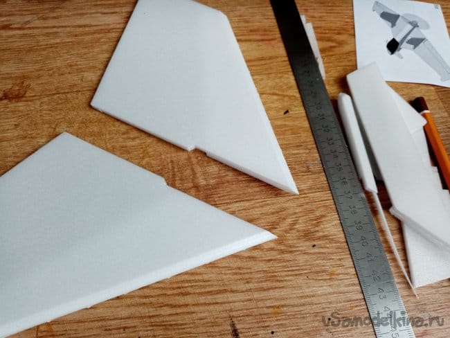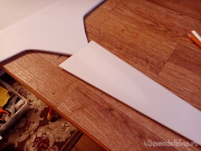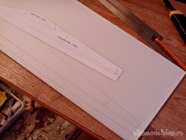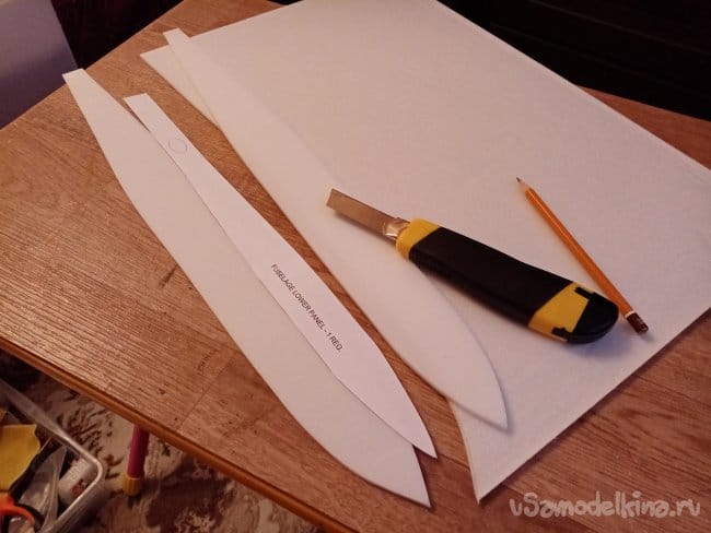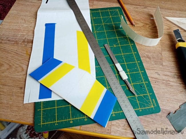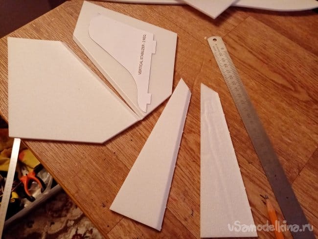 Пока стенки фюзеляжа клеятся вырезаю кили, маленько большего размера. С усиливающими накладками на переднюю грань.