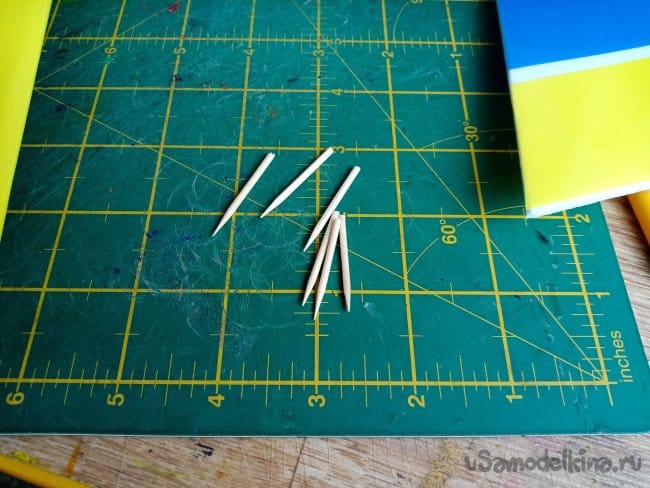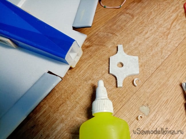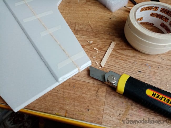 Перед установкой подрезаю скотч в районе килей, иначе титан не приклеится к пленке. Устанавливаю кили на клею и усиливаю половинками зубочисток, проверяю вертикальность.
