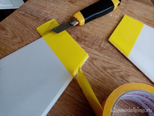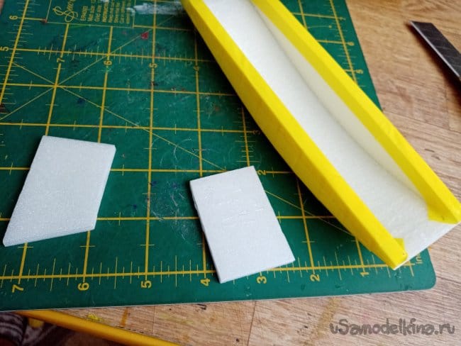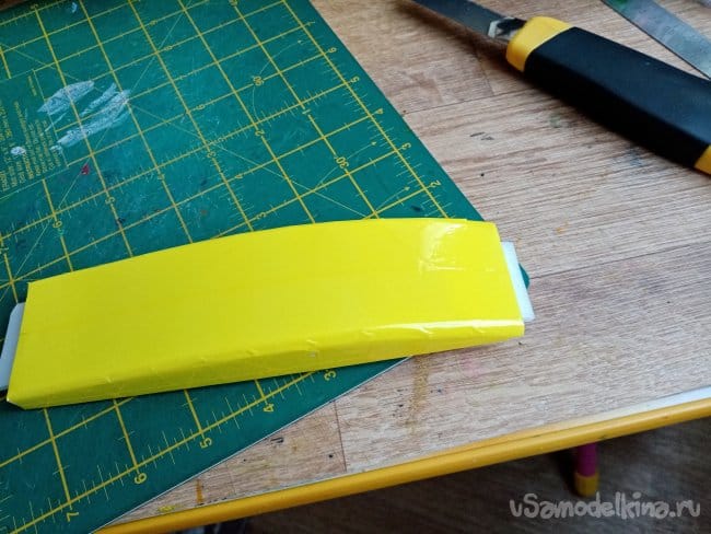 Затем отрезаю кабину, её оклею тоже желтым, для контраста. Приклеиваю фиксаторы и подгоняю их длину по месту.