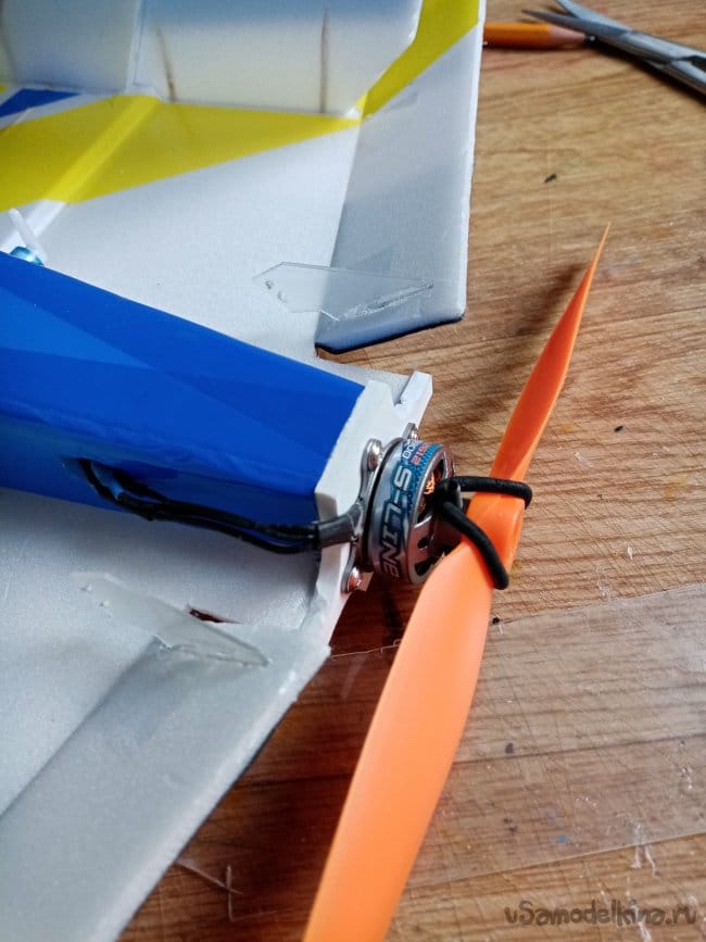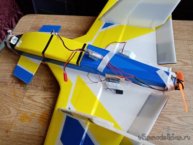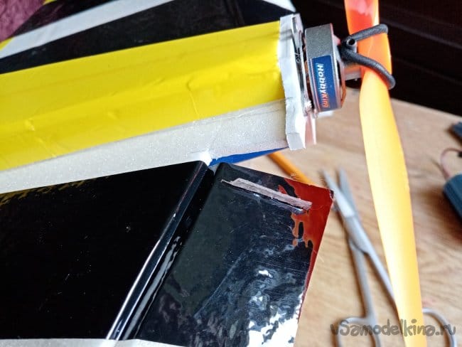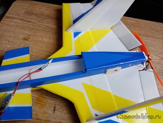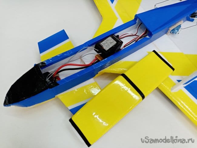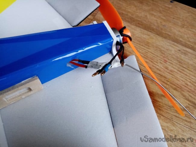 Устанавливаю мотор и регулятор. провода от регулятора проталкиваю в отверстие фюзеляжа предварительно приклеив скотчем к проволоке. Соединяю, проверяю работу мотора. Если крутится не в ту сторону, достаточно поменять местами два любых провода.