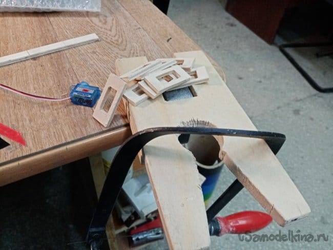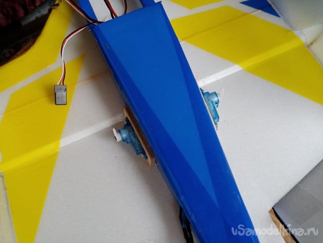 Сервоприводы решил вдруг устанавливать в фюзеляж, до этого монтировал в кили. Не захотелось видеть торчащие по крылу провода. Как установить? Кили мешают прикрутить сервоприводы к накладкам. Собрал все вместе отдельно, прикрутил сервоприводы и наконец приклеил в нужное место на фюзеляже.