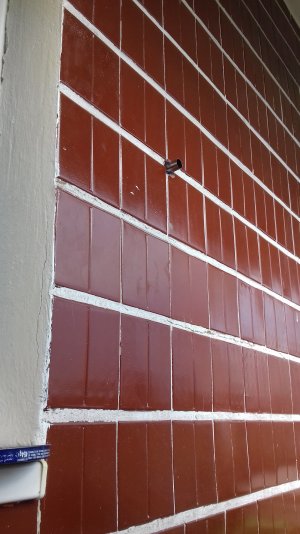 Прикрутив уловитель к стене саморезами, поставил трубу и нарисовал место для отверстия. Отверстие вырезал болгаркой, получился минимальны зазор.