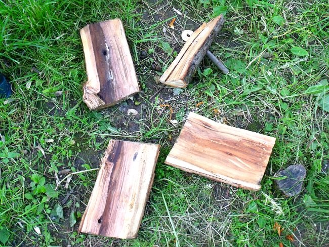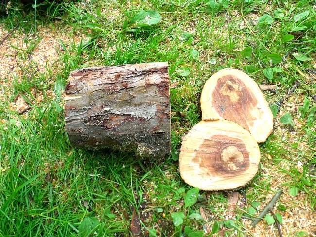 От бревна отпиливаются три части. Одна основная, которая станет корпусом, и и два блина, которые будут потолком и полом. Основное бревно рубится сперва на четыре части. Затем от каждой четверти отрубается та часть, которая была сердцевиной.