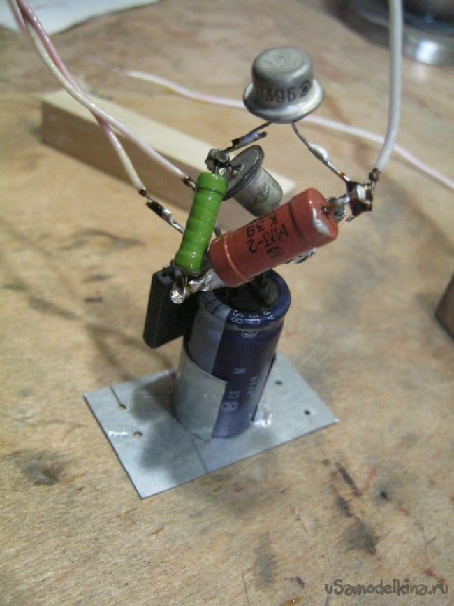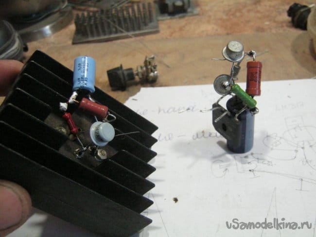 Первым делом подобрал элементы, привел в порядок их выводы, проверил на тестере элементов. К слову, транзисторы вроде П213 тестер игнорирует, проверять его пришлось старым добрым способом – попереходно, тестером.