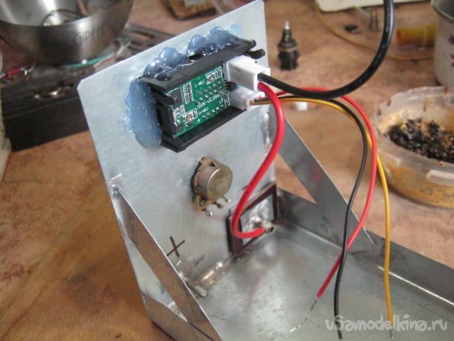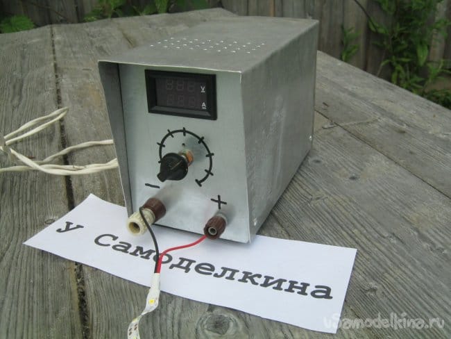 По сравнению с исходной схемой, стрелочный вольтметр заменен на цифровой китайский модуль-измеритель напряжения и тока – не капли не жалко, а ребенку радость. Кроме прочего в голове лучше уложится зависимость потребляемого тока от напряжения, будет видно как напряжение просаживается на относительно мощной нагрузке, напряжение на конкретной нагрузке можно установить с учетом этой просадки (по сравнению со шкалой под ручкой R8) и т.д. Словом, в учебно-наглядных целях. Единственный минус – пришлось озаботиться личным микро-БП для измерителя, впрочем, он допускает широкий диапазон напряжений для питания и удалось легко подобрать ему старый исправный сетевой адаптер-зарядку для мобильного телефона. При этом, индикаторной неоновой лампой с токоограничительным резистором можно смело манкировать – светящиеся цифры измерителя преотлично их заменят.
