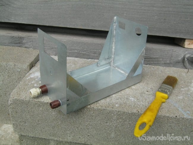 Выпилив и подогнав проемы для всех установочных элементов, спаял нижнюю часть корпуса – поддон, торцевые стенки, раскосы (зачистить, нанести «кислоту паяльную» (хлористый цинк), лудить; после пайки хорошо промыть водой со щеткой, в воду можно добавить чуток соды).