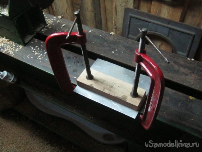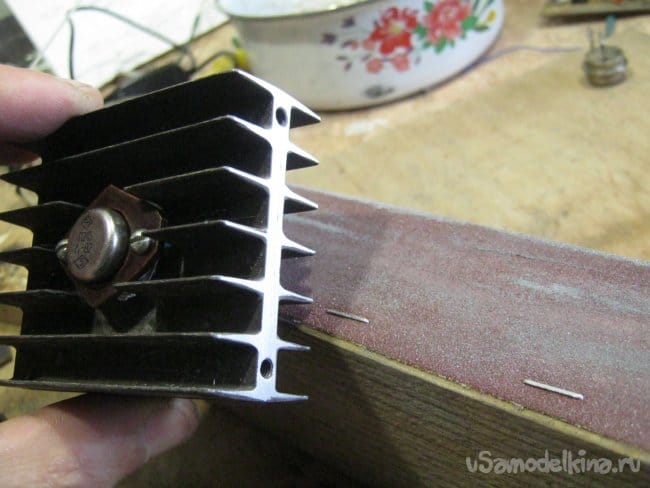 Радиатор с транзистором крепится при помощи двух коротких винтиков, железку пришлось немного поёрзать на бруске с пришпиленной наждачной шкуркой, чтобы выровнять её нижнюю, соприкасающуюся с поддоном часть. Так она стоит ровнее и плотнее. Под винты подложил кузовные (широкие) шайбы, в резьбу капнул лака для застопоривания.