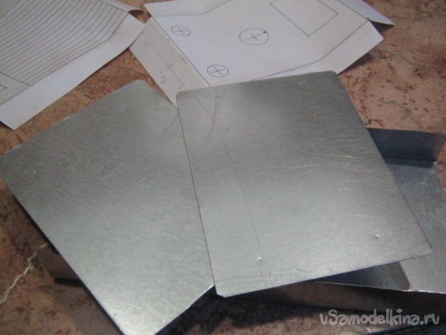 Убедившись в работоспособности макета, приступил к самому сложному – корпусу. Он был изготовлен из листового металла способом гнутья, частично пайки и состоит из двух П-образных частей. Нижняя – поддон и торцевые стенки сделаны из оцинкованной стали (легко паять), крышка – из тонкого алюминиевого листа (старый кровельный лист). Электрохимический ряд напряжений металлов вполне допускает их механическое соединение.