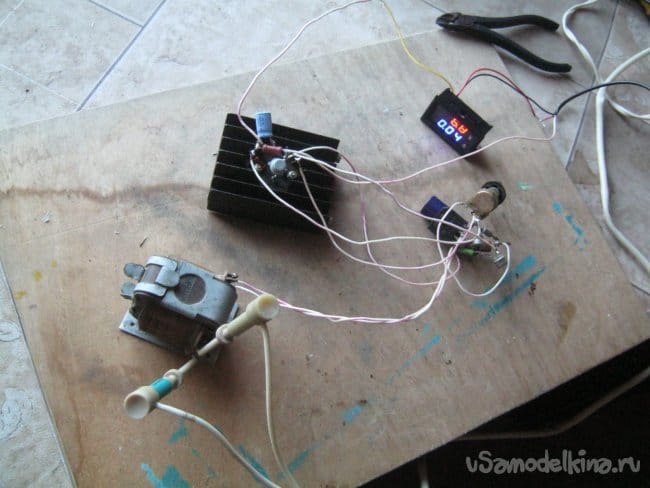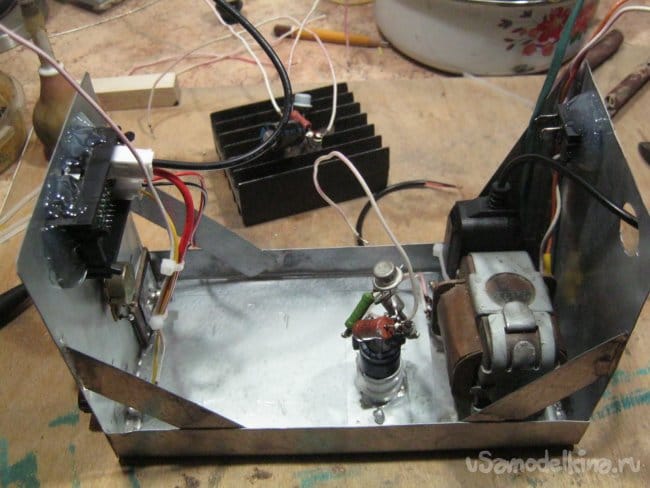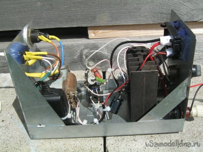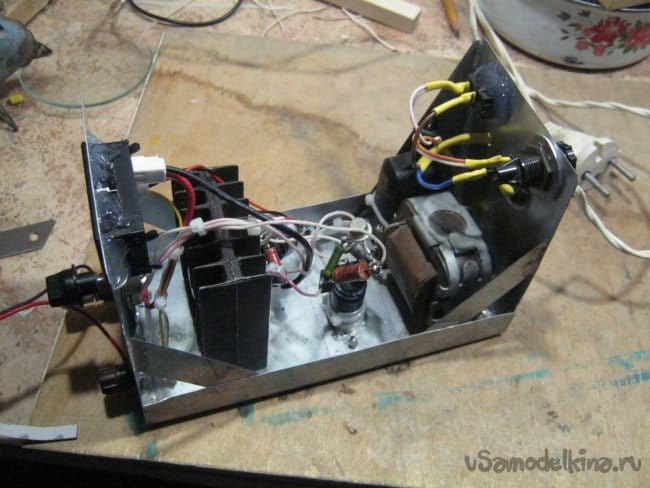 Собрал прибор навесным манером для проверки работоспособности. Собственно, элементов в схеме немного, значительная их часть крупные, установочные. Их выводы удобно использовать как контактные площадки. Кроме них конструкция внутренней части блока не предполагает дополнительных точек крепления. Все мелкие элементы сгруппированы в две части так, чтобы между ними было меньше соединительных проводов. Первая часть имеет опору – крупную оксидную емкость (С1), вторая – ножки регулирующего транзистора на радиаторе.